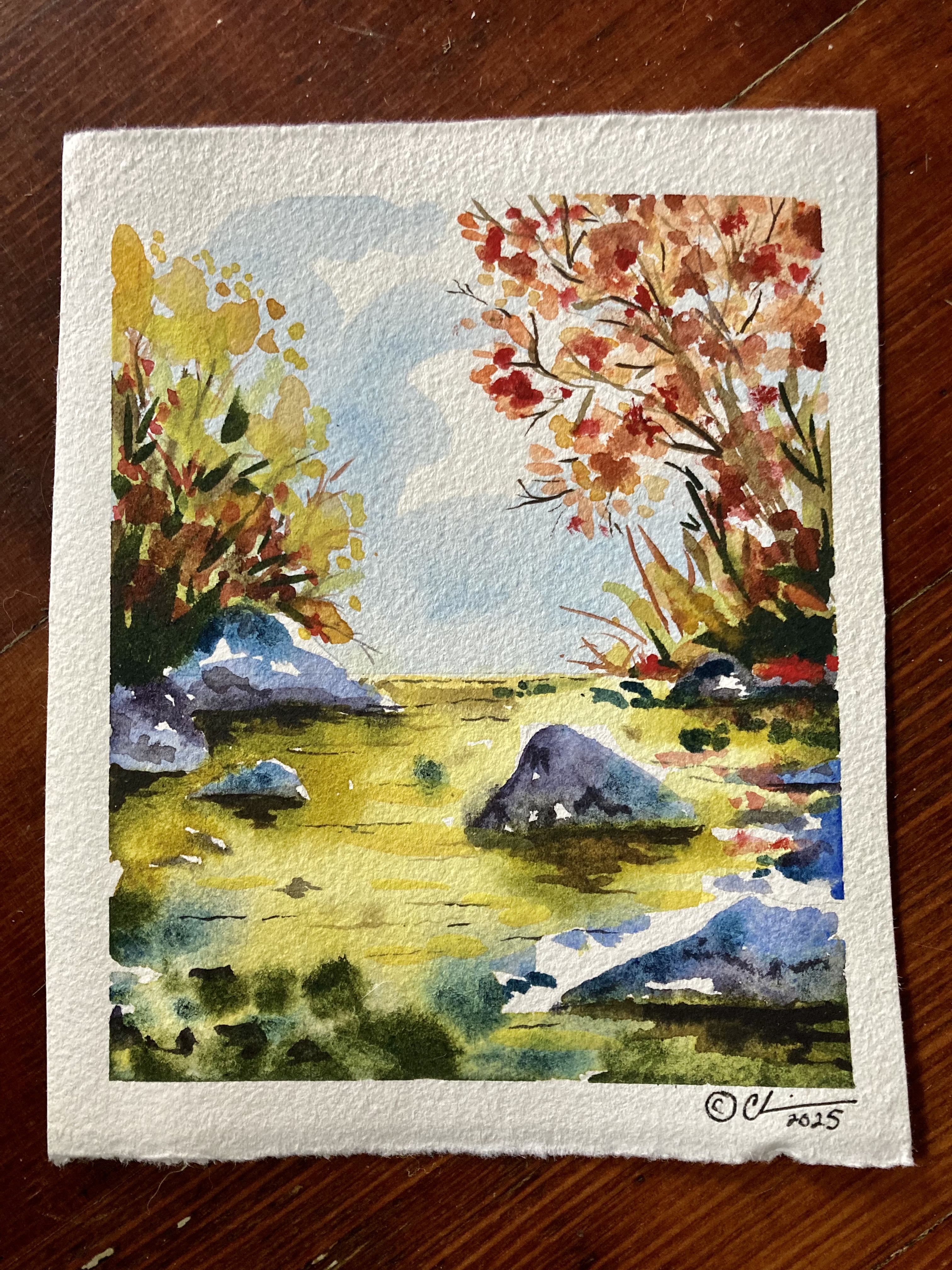 “A Peaceful Place" is an original watercolor on watercolor paper. I do daily watercolor paintings. This is one.
