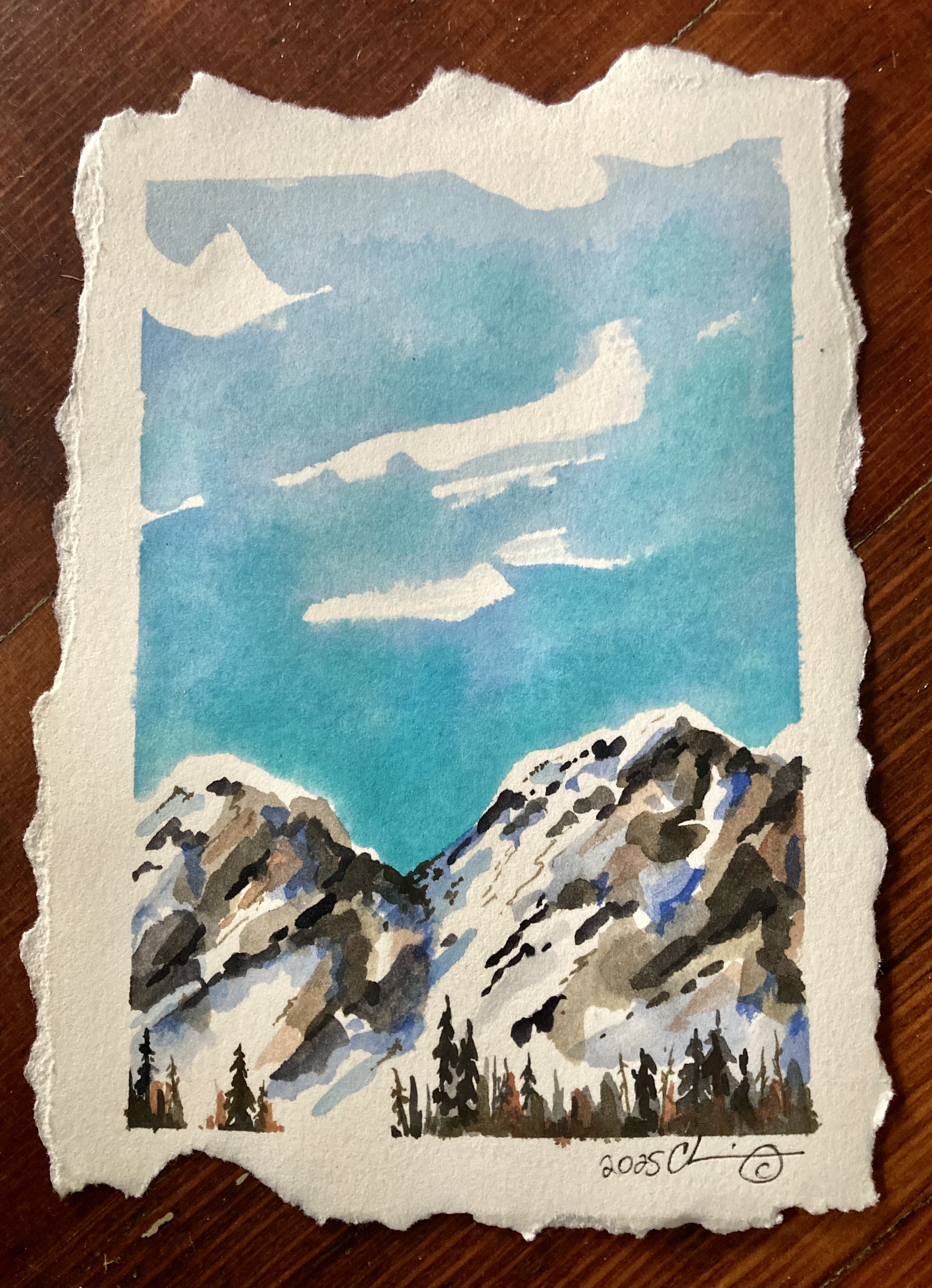 “Peaks" is an original watercolor on watercolor paper. I do daily watercolor paintings. This is one.